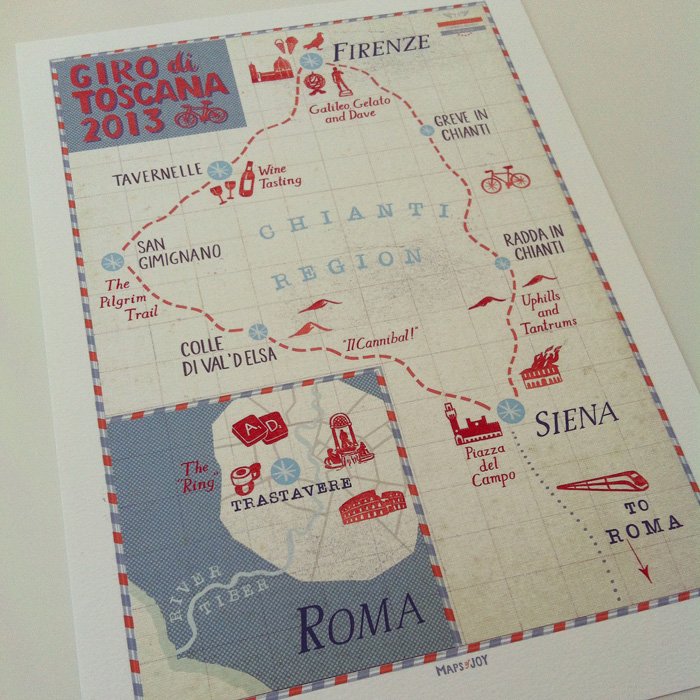 Angharad and Dan wanted a map to commemorate the epic cycle trip they took around the gorgeous Chianti region of Italy, culminating in a stay in Rome, where Dan got down on one knee and well, I’ll let them tell you…